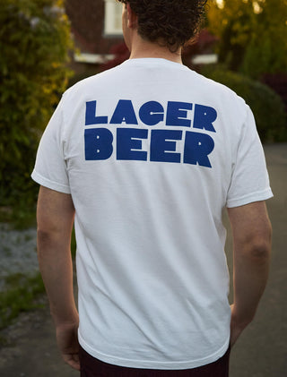 Lager Beer shirt screen printed by Witly in Hamilton. Lager Beer on the back and Sonnen Hill Logo on the front left chest. White Comfort Colours T-Shirts.